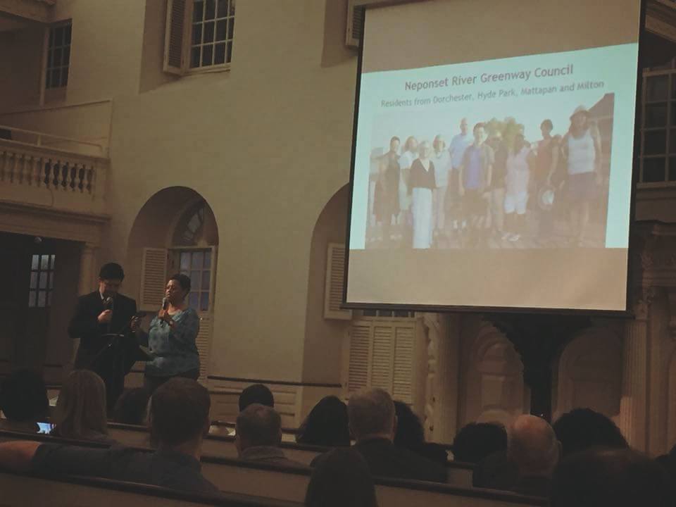 Neponset River Greenway Council members Vivian Ortiz and Lee Toma shared the story of NIMBY on the Neponset at Livable Streets' StreetTalk10in1 downtown at the Old South Meetting House on Tuesday, December 5. Council member Ellie Spring backed them up. Photos from Vivian Ortiz.